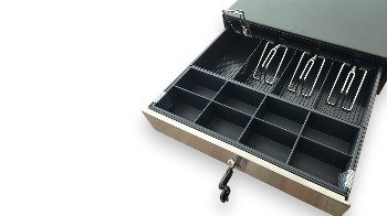 Cash drawer. Front opening with stainless steel front. Dimensions: 350 x 110 x 405 mm. 4 flat note compartments, 8 coin compartments. Colour: Black.